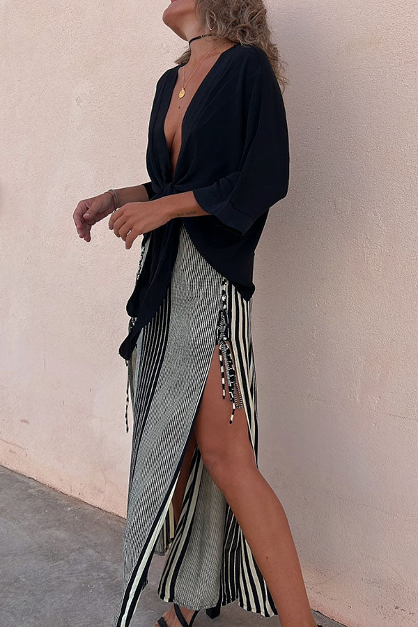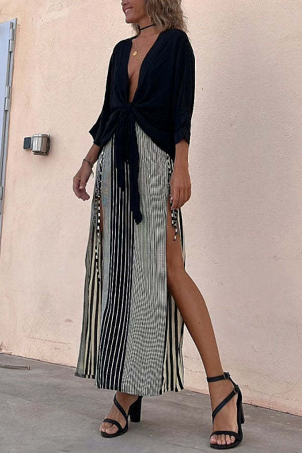 Angel Dust Tie Front Top and Striped Lace-up Slit Skirt Set